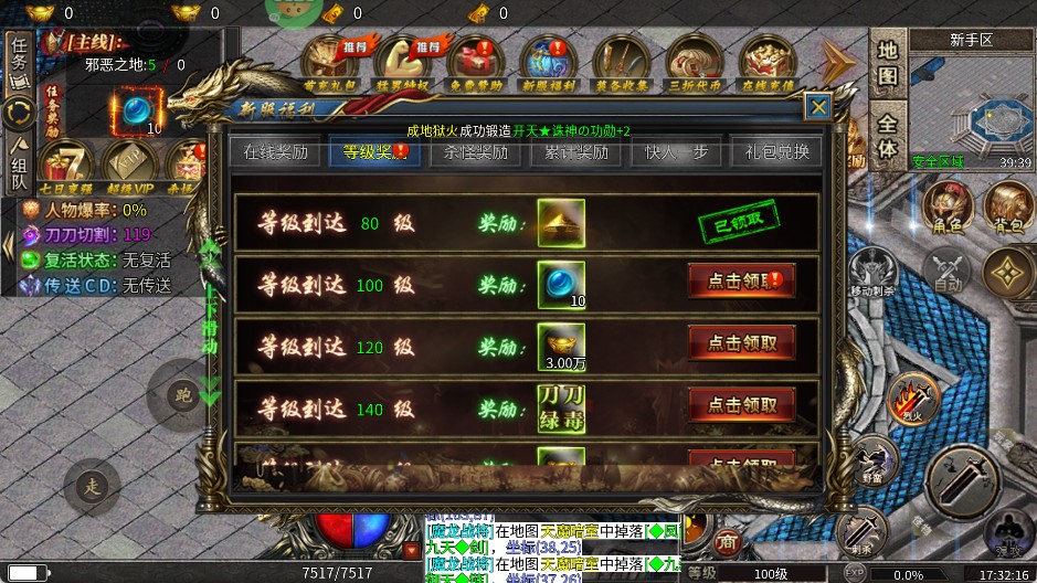 1、进入游戏后,先把系统赠送的福利一键领取,包括自动拾取、自动回收功能。这些都能让你解放双手,轻松挂机刷怪。