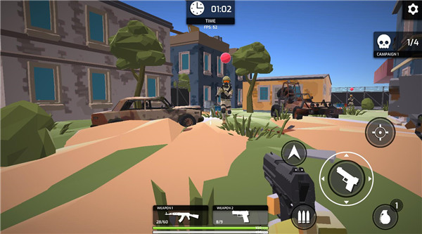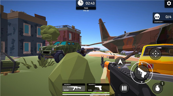 1. 进入低多边形风格的射击游戏,操控枪械在初始场景(含飞机、车辆、油桶)中探索,瞄准目标进行射击。