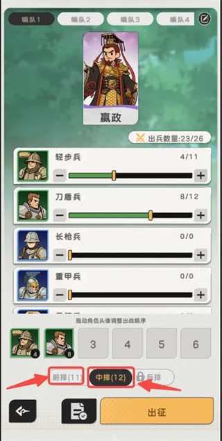 2、中排出战了12个兵,但刚进入战斗时,中排也只会显示4个兵,还有8个兵在后面替补(只有前面的兵死掉,才会补上去)