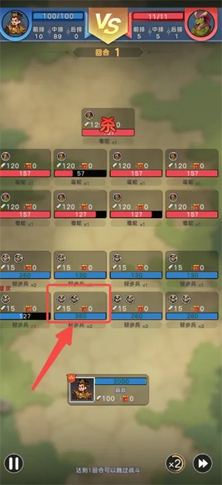3、当出战总数量超过100个兵之后,兵会堆叠起来,比如2个兵堆叠在一起,站在一个位置(生命叠加,造成双倍伤害)