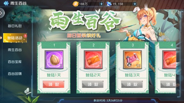 每日登录可领取活动专属道具,包括紫色种子、红色招募券和双倍幸运券,助力抽卡与活动兑换,剩余时间3天,需尽快领取。