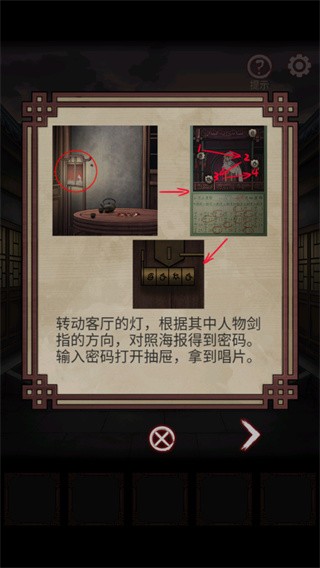 1、进入中间屋子,根据提示打开抽屉拿到唱片;