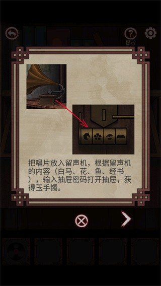 2、将唱片放入留声机,根据提示打开抽屉,获得玉手镯;