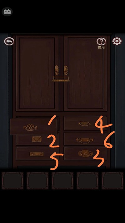 2、一直往里走到墓室婚礼,右边墙上有六个抽屉,点击一个,下一个就会打开,记下顺序,因为第二个固定,所以以此为基准;