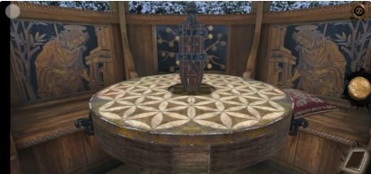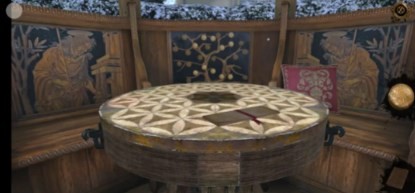 7、然后开启第二道机关,先向右翻转,再向下翻转机关(这里将机关上小球对应后方椅子上较亮的球即可)