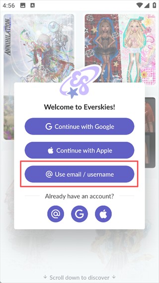 1、下载并打开永远的天空虚拟装扮(游戏可以打开,请耐心等待几分钟),点击下方的使用邮箱/用户名注册。