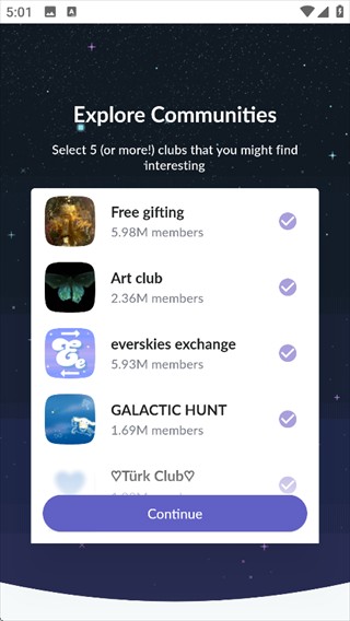 5、在下方勾选至少5个兴趣社区俱乐部,接着点击下方的继续。