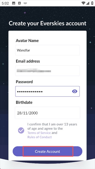 6、输入用户名、邮箱地址、密码和生日并点击下方的创建账户按钮。